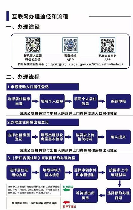 (四)發(fā)放。受理窗口領(lǐng)取或郵政快遞寄送。通過“杭州市居住證服務(wù)平臺”居住證預(yù)約受理模塊填寫個人基本信息,上傳居住證申領(lǐng)相關(guān)證明材料后,根據(jù)個人安排預(yù)約辦證時間。經(jīng)公安機(jī)關(guān)初審?fù)ㄟ^后,流動人口可以攜帶相關(guān)證明材料原件前往指定受理點(diǎn)辦理居住證。