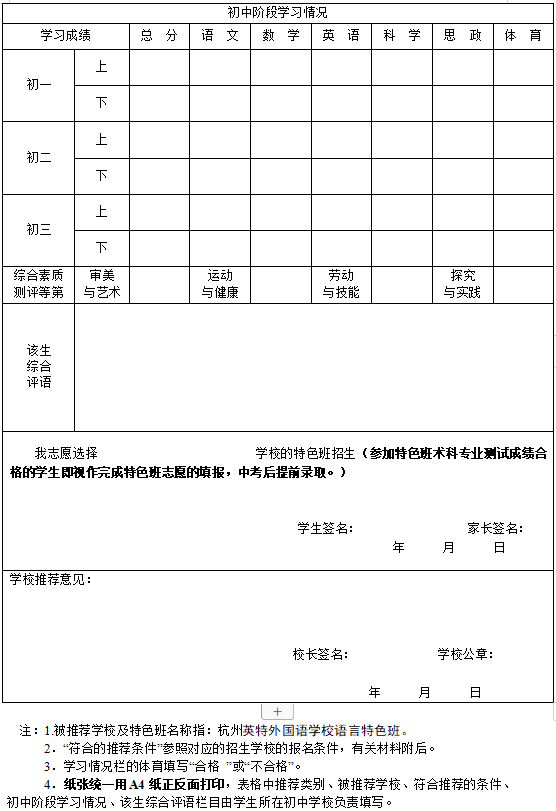 1. 自5月17日起至5月23日止,學(xué)生可由本人提出申請,向所在學(xué)校領(lǐng)取填寫《2022年余杭區(qū)、臨平區(qū)普通高中特色班招生推薦表》(以下簡稱《推薦表》,如下圖所示)(每位學(xué)生限報一所普通高中的一類特色班,須經(jīng)學(xué)生本人及家長親筆簽名),由所在初中學(xué)校負(fù)責(zé)對學(xué)生填寫的《推薦表》進行審核,經(jīng)公示無異議的,簽署意見并加蓋學(xué)校公章后,送到我校招生辦。