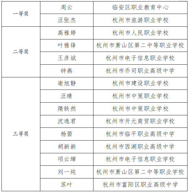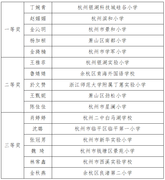 在各區(qū)、縣(市)教育部門和直屬學(xué)校推薦的基礎(chǔ)上,經(jīng)組織參賽材料評審以及面試、決賽等,最終評出小學(xué)組、初中組、高中組一、二、三等獎共64名,其中,小學(xué)組一等獎5名、二等獎5名、三等獎6名,初中組一等獎4名、二等獎6名、三等獎6名,普高組一等獎4名、二等獎5名、三等獎8名,職高組一等獎2名、二等獎4名、三等獎9名。