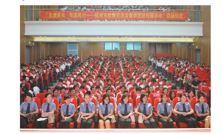 《杭州超限教育中心瑪林2015年5月26日訊》5月22日下午,學軍高一學子齊聚國際交流中心,近600名同學用心在感受“關愛成長、與法同行”的聲音;顒友埩藢W軍中學校長陳立群,杭州市人民檢察院副檢察長葉玉秋,市委教育工委副書記兼教育局副局長金波,市普法辦副主任王正航等領導出席。陳校長激情澎湃的發(fā)言帶動了大家的積極性,葉玉秋女士和金波局長的發(fā)言讓我們了解到這次講座的意義,讓學軍學子投入到這場有意義的講座當中。嘉賓們?yōu)楹贾菔袡z察官法治宣講團成員頒發(fā)聘書,向學軍中學學生代表贈送宣傳資料。