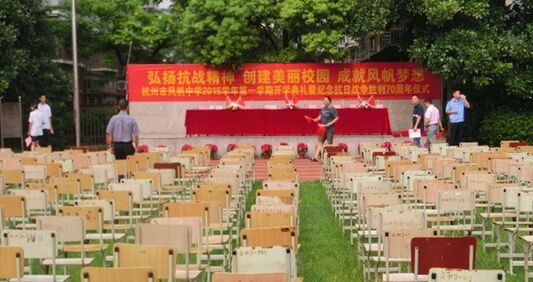 《杭州超限教育中心王林2015年9月7日訊》近日,杭州市風(fēng)帆中學(xué)的操場(chǎng)上整齊得排列著一排排椅子,等待著新學(xué)期歸來的同學(xué)們。校園的籃球場(chǎng)上掛起了紀(jì)念中國人民抗日戰(zhàn)爭(zhēng)暨世界反法西斯戰(zhàn)爭(zhēng)勝利70周年的宣傳橫幅,全體同學(xué)們以班級(jí)為方陣,手拿小紅旗,等待著開學(xué)典禮的進(jìn)場(chǎng)儀式。