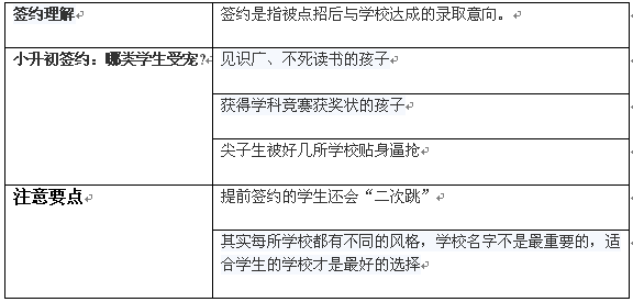 《杭州超限教育中心王小林2015年10月28日訊》小升初簽約一般是指學校和意向學生雙方達成協(xié)議,入學前的合約。具體詳情理解及哪些類型的孩子易受學校喜歡見下表: