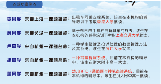 《杭州超限教育中心李林2016年3月08日訊》根據(jù)國(guó)務(wù)院《關(guān)于深化考試招生制度改革的實(shí)施意見(jiàn)》國(guó)發(fā)〔2014〕35號(hào)高考招生文件精神,提倡我國(guó)重點(diǎn)大學(xué)進(jìn)行自主招生,主要選拔具有學(xué)科特長(zhǎng)和創(chuàng)新潛質(zhì)的優(yōu)秀學(xué)生。此項(xiàng)政策的推出為一些具有創(chuàng)新發(fā)明專(zhuān)利的特長(zhǎng)學(xué)生,開(kāi)辟了一條獨(dú)特的高考升學(xué)通道。據(jù)我國(guó)重點(diǎn)大學(xué)自主招生簡(jiǎn)章公示,對(duì)于具有創(chuàng)新潛質(zhì)的中學(xué)生,在招生錄取上給予在學(xué)校錄取線基礎(chǔ)上3-60分的加分鼓勵(lì),讓學(xué)子們實(shí)現(xiàn)名校夢(mèng)想!同樣作為出國(guó)留學(xué)的必備能力—?jiǎng)?chuàng)新發(fā)明實(shí)踐活動(dòng)能力,也是學(xué)子們通向世界名校的必備素質(zhì)。本教育機(jī)構(gòu)專(zhuān)門(mén)成立了“發(fā)明”直通高考名校研究所,并開(kāi)展此次《發(fā)明直通高考名!確保拿到重點(diǎn)高校自主招生入場(chǎng)券》培訓(xùn)項(xiàng)目,能夠讓學(xué)生的創(chuàng)造發(fā)明能力迅速提升,給予全程指導(dǎo),直至拿到專(zhuān)利證書(shū),給予自主招生面試專(zhuān)業(yè)指導(dǎo),讓優(yōu)等中學(xué)生順利實(shí)現(xiàn)名校夢(mèng)想!詳細(xì)內(nèi)容如下: