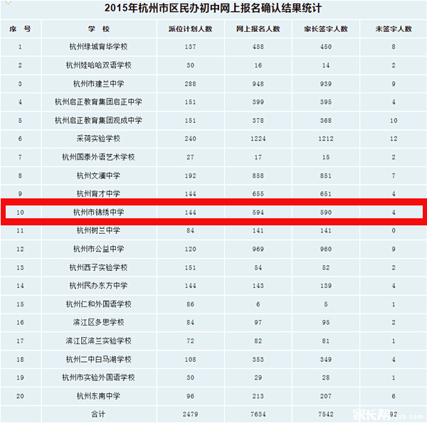 2015年杭州市區(qū)民辦初中網(wǎng)上報名確認(rèn)結(jié)果統(tǒng)計