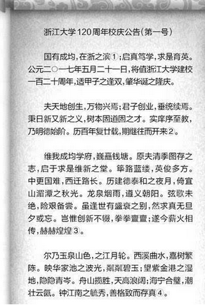 《杭州超限教育中心李林2016年05月23日訊》 昨天,浙江大學(xué)師生的朋友圈被一篇“雄文”刷屏了。這篇文章通篇文言文,是浙大發(fā)布的120周年校慶第一號(hào)公告。