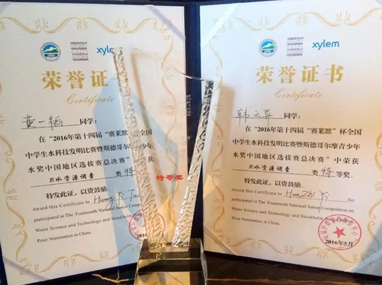 《杭州超限教育中心李林2016年05月31日訊》 2016年5月21日,由環(huán)境保護部宣傳教育中心,賽萊默(中國)有限公司舉辦的第十四屆“賽萊默”杯全國中學(xué)生水科技發(fā)明比賽暨斯德哥爾摩青少年水獎中國地區(qū)選拔賽總決賽在廣東省開平市舉行。我校高二(1)班黃一韜,高一(2)班韓之異同學(xué)憑借《臺州市長潭水庫水質(zhì)錳超標(biāo)分析研究及對策》的論文以及出色的現(xiàn)場與專家答辯表現(xiàn),在全國各地前來參賽的選手中脫穎而出,榮獲B水資源調(diào)查類特等獎。
