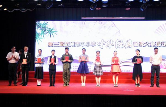 《杭州超限教育中心李林2016年06月14日訊》為進(jìn)一步弘揚(yáng)中華優(yōu)秀傳統(tǒng)文化,全方位、多形式、多渠道在全市中小學(xué)校推動(dòng)中華優(yōu)秀傳統(tǒng)文化的宣傳、普及與實(shí)踐,杭州市教育局于4月至6月在全市范圍內(nèi)開展第三屆杭州市中小學(xué)中華經(jīng)典誦讀大賽。經(jīng)各區(qū)、縣(市)初評(píng)推薦,大賽共收到200余份入圍復(fù)賽作品,經(jīng)專家評(píng)委推選,選出小學(xué)個(gè)人組、集體組,中學(xué)個(gè)人組、集體組共40份作品參加現(xiàn)場(chǎng)決賽,最終決出一等獎(jiǎng)16個(gè),二等獎(jiǎng)24個(gè),評(píng)出優(yōu)秀指導(dǎo)老師20個(gè)。 6月5日,中華經(jīng)典誦讀大賽決賽在杭州市青少年發(fā)展中心舉行,邀請(qǐng)資深主持人、播音員等專家現(xiàn)場(chǎng)點(diǎn)評(píng),近800位觀眾現(xiàn)場(chǎng)觀摩。杭州市圖書館事業(yè)基金會(huì)理事長(zhǎng)、市關(guān)工委常務(wù)副主任、原市政協(xié)副主席曾東元,市委教育工委副書記兼市教育局副局長(zhǎng)金波,市文明辦副主任劉婷和浙江電視臺(tái)教育科技頻道副總監(jiān)、著名主持人小強(qiáng)等嘉賓為獲獎(jiǎng)選手、指導(dǎo)教師頒獎(jiǎng)。 比賽中,選手們通過吟、誦、唱、舞等表演形式演繹了傳統(tǒng)經(jīng)典作品,獨(dú)具匠心的編排,唯美詩意的畫面,聲情并茂的吟唱,詮釋了詩詞的獨(dú)特韻味,讓現(xiàn)場(chǎng)充滿了國學(xué)經(jīng)典的馨香。