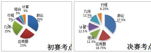 我們可以看下2016年希望杯初賽和決賽考察知識(shí)點(diǎn)的分布餅圖:
