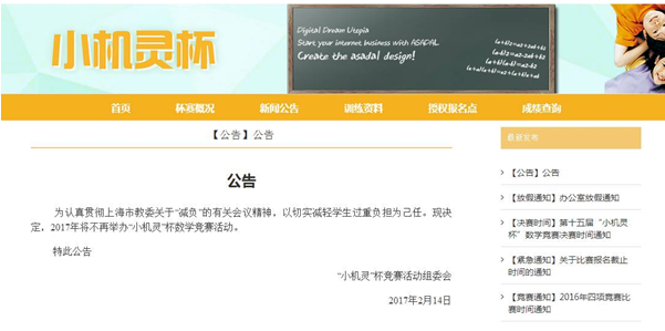 其中 “小機(jī)靈”杯競賽活動組委會昨天在其官方網(wǎng)站首頁位置發(fā)布公告稱,為認(rèn)真貫徹上海市教委關(guān)于“減負(fù)”的有關(guān)會議精神,以切實(shí)減輕學(xué)生過重負(fù)擔(dān)為己任,F(xiàn)決定,2017年不再舉辦“小機(jī)靈”杯數(shù)學(xué)競賽活動。