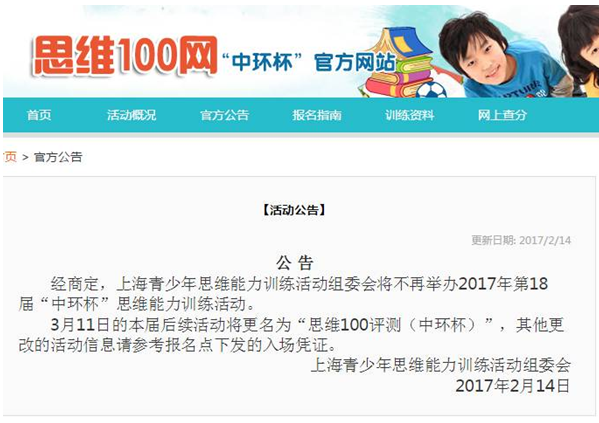 上海青少年思維能力訓(xùn)練活動組委會昨天也發(fā)布公告,不再舉辦2017年第18屆“中環(huán)杯”思維能力訓(xùn)練活動。不過杭州的家長不要擔(dān)心,3月11日的中環(huán)杯決賽改名為“思維100測評(中環(huán)杯)”正常進(jìn)行。