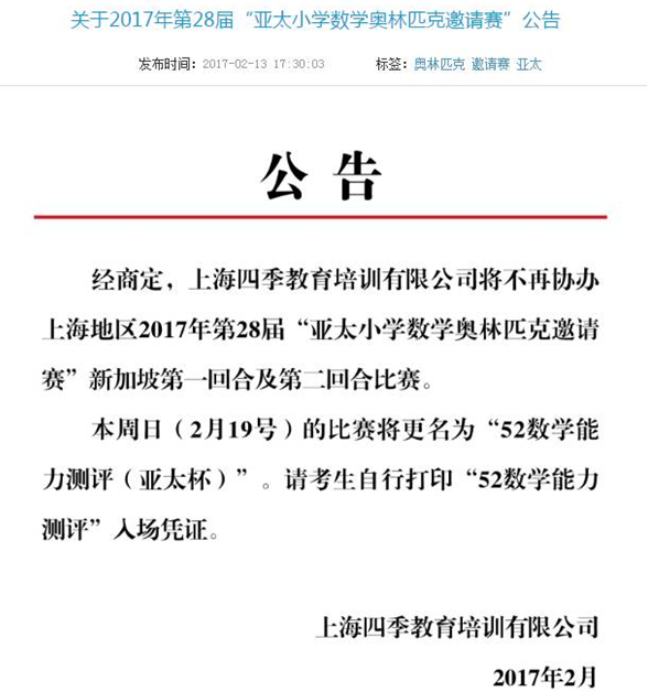 上海四季教育培訓(xùn)有限公司的公告顯示,該公司將不再協(xié)辦上海地區(qū)2017年第28屆”亞太小學(xué)數(shù)學(xué)奧林匹克邀請賽“新加坡第一回合及第二回合比賽。