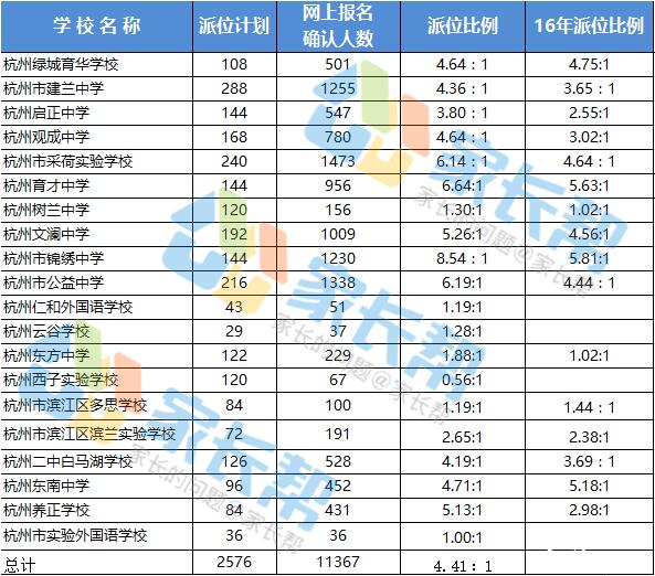 2017年杭州小升初派位報(bào)名確認(rèn)人數(shù)為11367人(比去年多了2532,派位計(jì)劃人數(shù)2576人,下圖的2017各個(gè)杭州民辦初中的派位比例: