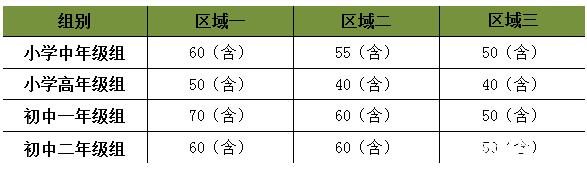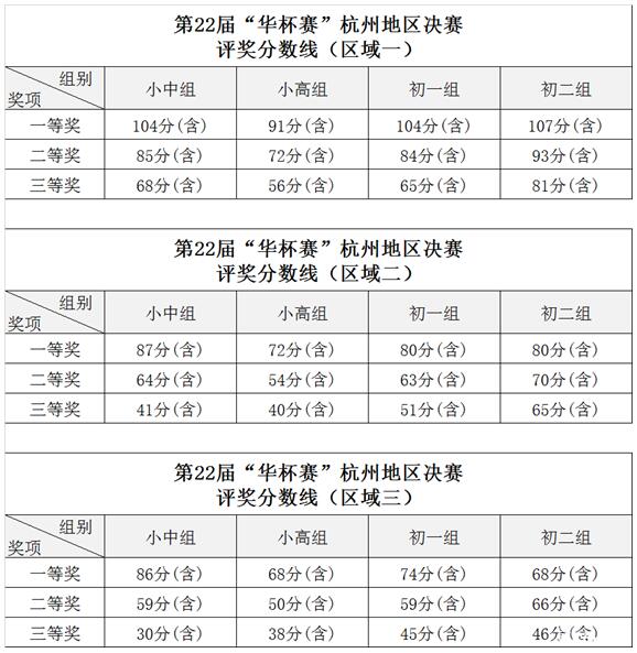 按照第22屆“華杯賽”杭州地區(qū)組織工作方案中初賽晉級規(guī)則和公平、公正、公開的賽事原則,初賽成績優(yōu)秀者按照各參賽區(qū)域各組別人數(shù)30%比例晉級決賽,具體晉級分數(shù)線如下: