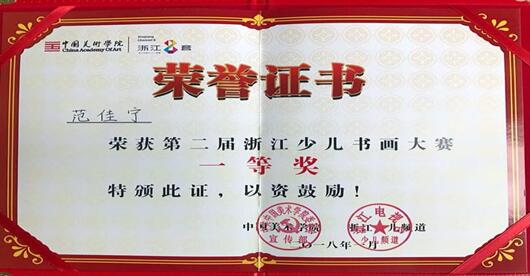 上圖:范佳寧獲獎證書“第二屆浙江少兒書畫大賽一等獎”