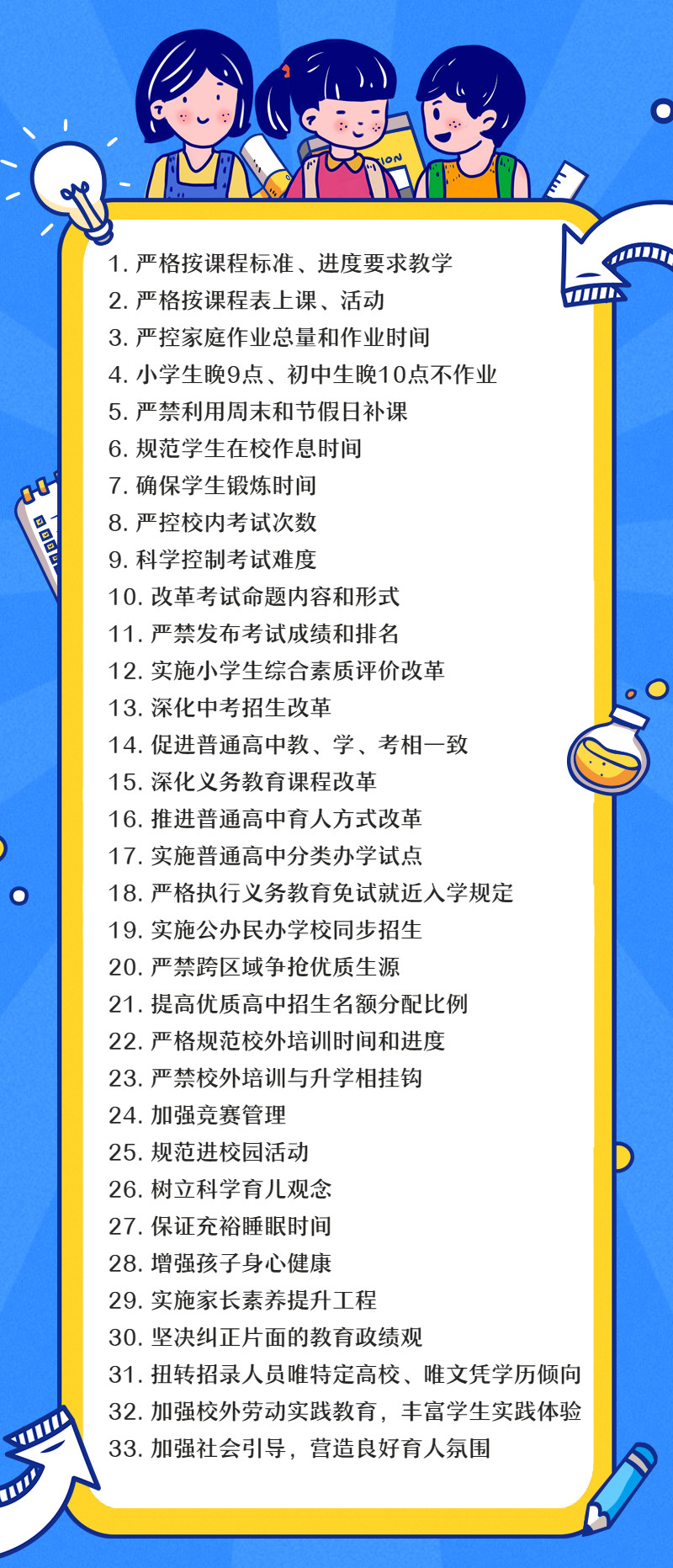 33.加強(qiáng)社會引導(dǎo),營造良好育人氛圍。嚴(yán)禁各類新聞媒體炒作考試成績排名和升學(xué)率,不得以任何形式宣傳所謂的中考、高考“狀元”。加強(qiáng)對網(wǎng)站、自媒體平臺等的監(jiān)管和引導(dǎo),防止對減負(fù)工作的誤導(dǎo)。推出中小學(xué)生減負(fù)公益廣告,健全完善社會心理疏導(dǎo)機(jī)制,共同關(guān)心孩子成長。